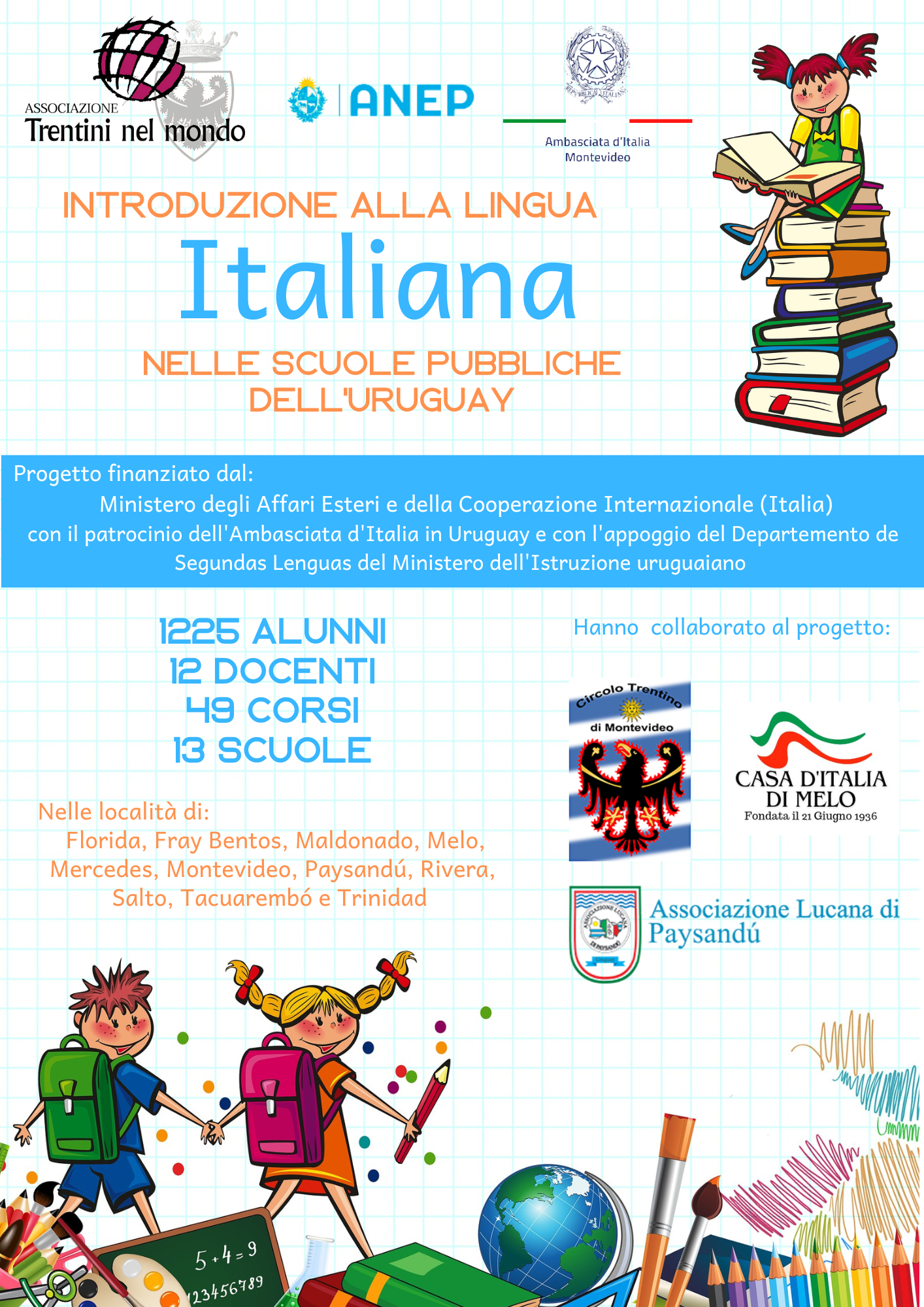 Le scuole pubbliche interessate sono dodici con 44 corsi attivati e nove docenti coinvolte. Risale all’ottobre dell’anno scorso la presentazione al Ministero degli Affari Esteri e della Cooperazione Internazionale da parte della Trentini nel mondo, attraverso l’Ambasciata Italiana in Uruguay, di un progetto che proponeva l’istituzione di corsi curricolari di lingua italiana con l’obiettivo di avvicinare allo studio della lingua italiana gli studenti degli ultimi anni della scuola primaria dell'Uruguay. Si tratta di corsi di livello A1, nei quali l'apprendimento avviene attraverso un approccio integrato tra quattro abilità: leggere, scrivere, ascoltare e parlare. Il progetto prevede lo svolgimento di lezioni in presenza con l'utilizzo di materiale didattico specificamente prodotto per il corso. Sulla base dei suggerimenti fatti dal Departemento de Segundas Lenguas del Ministero dell'Istruzione uruguaiano (ANEP), il corso privilegia la metodologia dell'approccio comunicativo e del «cooperative learning». Per le lezioni digitali è inoltre previsto l'utilizzo della piattaforma "CREA" messa a disposizione dal Ministero dell'Istruzione dell'Uruguay. Attraverso l'utilizzo di materiali didattici vari e coinvolgenti, vengono inoltre presentati anche aspetti della cultura italiana. Edmondo De Amicis, Republica de Italia, Italia, sono alcuni dei nomi delle scuole frequentate dai 981 alunni che seguono le lezioni, che proseguiranno fino a novembre. Le scuole si trovano nelle seguenti località: Fray Bentos, Mercedes, Trinidad, Paysandù, Maldonado, Rivera, Tacuarembò, Florida, Salto e nei quartieri La Blanqueada e Aires Puros a Montevideo.